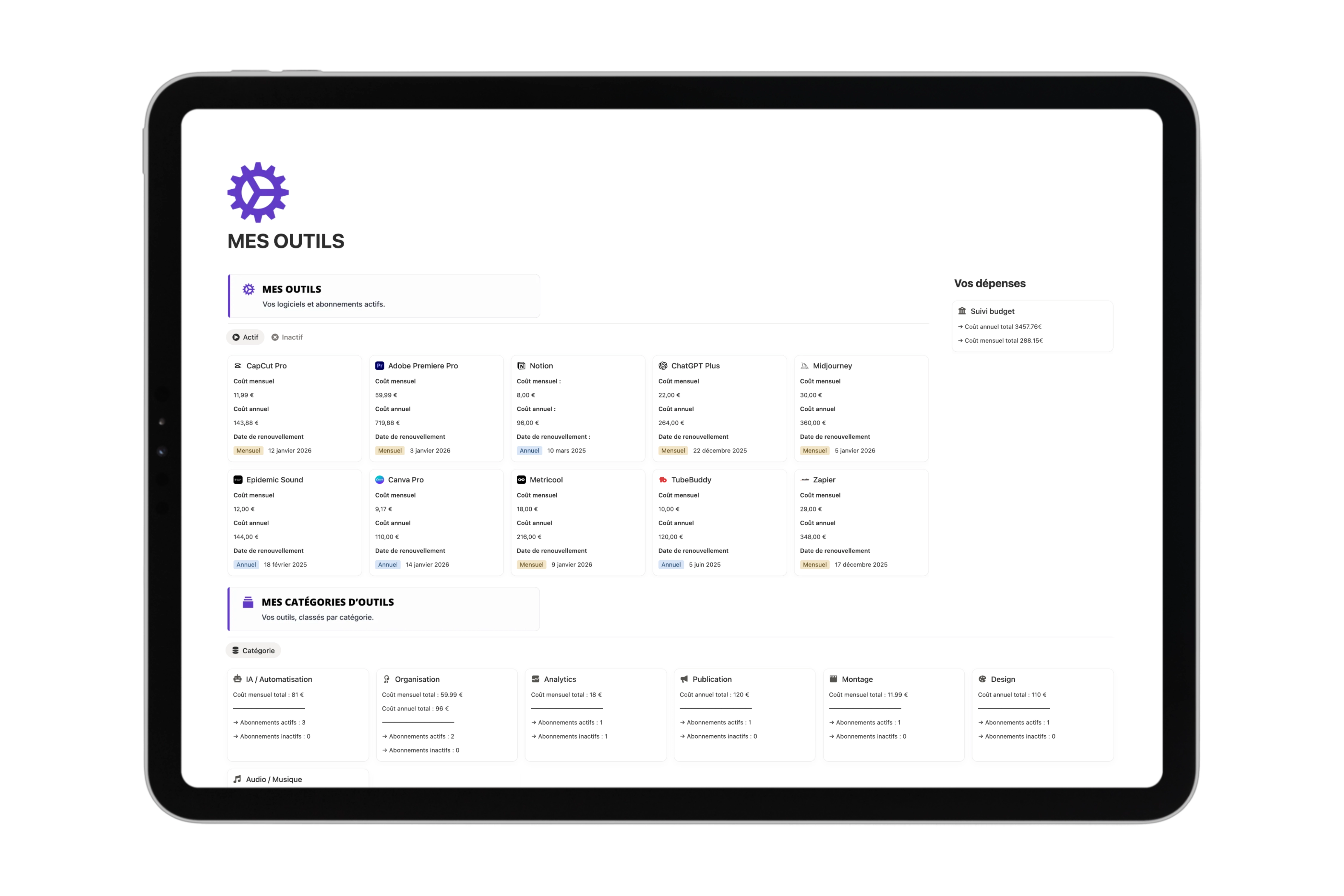 Recensez vos outils, suivez vos abonnements actifs, visualisez clairement vos dépenses mensuelles et annuelles.